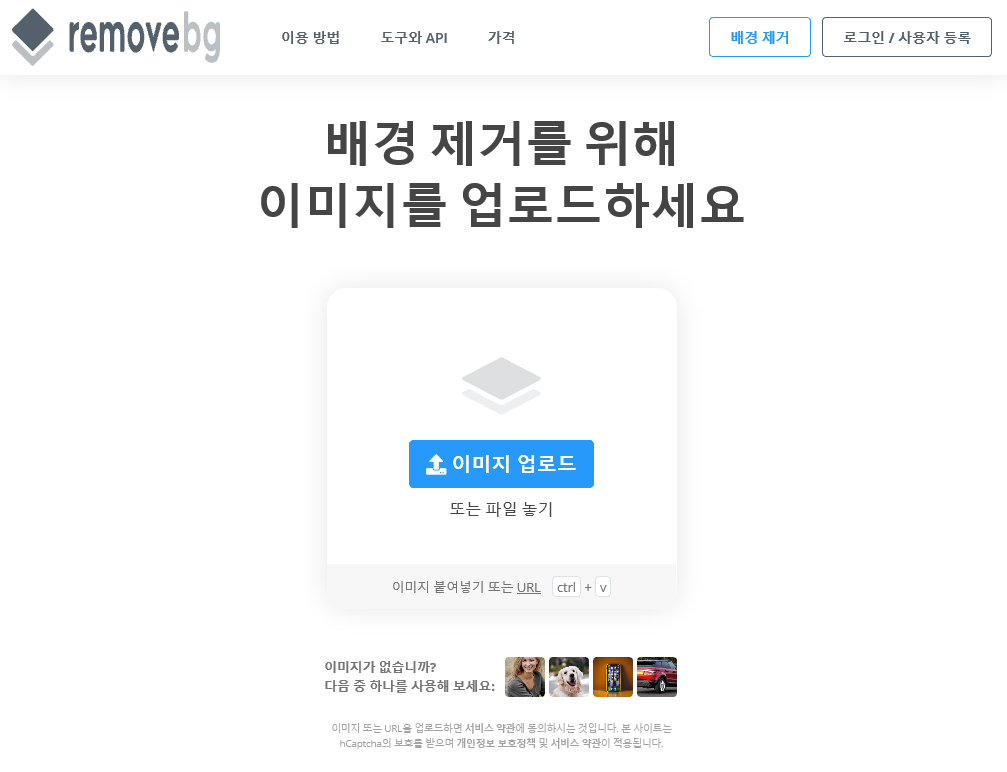 홈페이지는 상당히 심플합니다. 배경을 제거하기위한 이미지를 드래그&드롭하거나 '이미지 업로드'버튼을 클릭해서 원하는 파일을 찾아서 선택해 주면 됩니다.