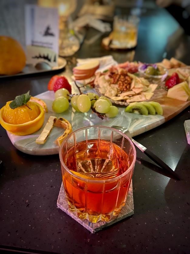 이러한 기본 세팅에 충실하여 찍은 사진이 아래의 사진입니다. 화면의 정중앙에 음식을 꽉 차게 하였고 칵테일 음료는 (격자 그리드를 보면서) 가운데 영역의 아래쪽 선상에 배치되도록 구도를 잡은 후 음료수에 초점을 맞추게끔 살짝 터지를 한 후 찍었습니다. 색상 보정은 스냅시드를 이용하였습니다.