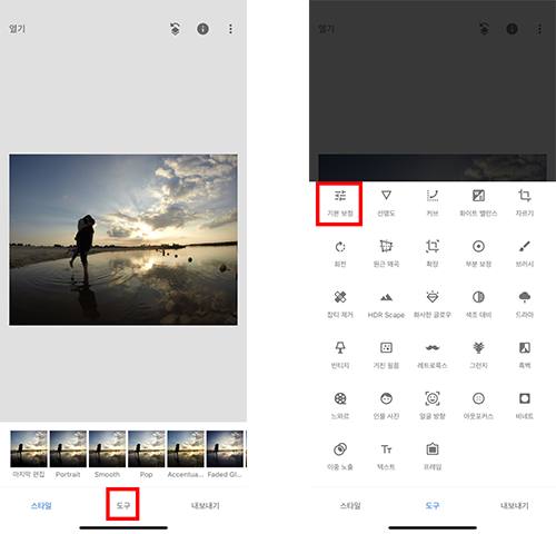 사진을 불러온 후 스타일에서 원하는 필터 효과를 줄 수 있지만 제품 사진에는 필터 효과를 안 주시는 게 좋습니다. 제품 본연의 색상을 보여주는 것이 중요하기 때문에 필터로 색상을 임으로 변경하면 안 됩니다. 아래쪽 메뉴에서 도구 메뉴를 선택한 후 첫 번째 있는 기본 보정을 선택합니다. 사진의 밝기와 관련 필수 기능들이 기본 보정 메뉴에 전부 있다고 생각하면 됩니다.