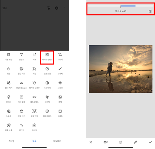 원하는 영역의 밝기를 조정해 주었다면 이번에는 화이트 밸런스를 조절해 보겠습니다. 도구 메뉴를 선택한 후 화이트 밸런스 메뉴를 선택합니다. 사진에 황혼의 느낌을 강조하기 위해서 화면을 오른쪽으로 드래그 해 주면 노랗고 오렌지 빛의 색조로 변합니다. 반대인 왼쪽으로 드래그하면 새벽 느낌의 파란 색조로 변할 것입니다.