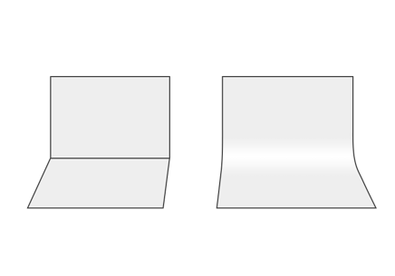 큰 사이즈의 도화지를 배경으로 사용 시에는 접거나 두장을 이어 붙이지 않도록 합니다. 접힌 부분이나 이어 붙인 부분이 두드러져 보이게 되면 눈에 많이 거슬리기 때문입니다. 아래 그림의 오른쪽처럼 벽부터 바닥까지 자연스럽게 이어지는 곡면이 되도록 세팅해 주시면 가장 자연스러운 배경이 연출되실 겁니다.
