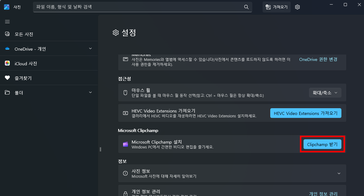 2. 사진앱에서 우측상단의 설정아이콘을 선택한 후 [Clipchamp 받기] 버튼을 눌러 주세요.