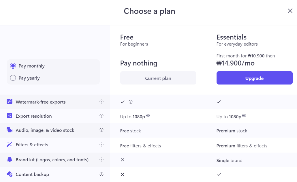 (상단의 다이아몬드 모양의 [Upgrade]버튼을 누르면 아래와 같은 유료버전으로 업그레이드할 수 있는 안내가 나옵니다. 프리미엄 스톡과 필터, 브랜드키트를 원하시면 업그레이드하시면 됩니다. )