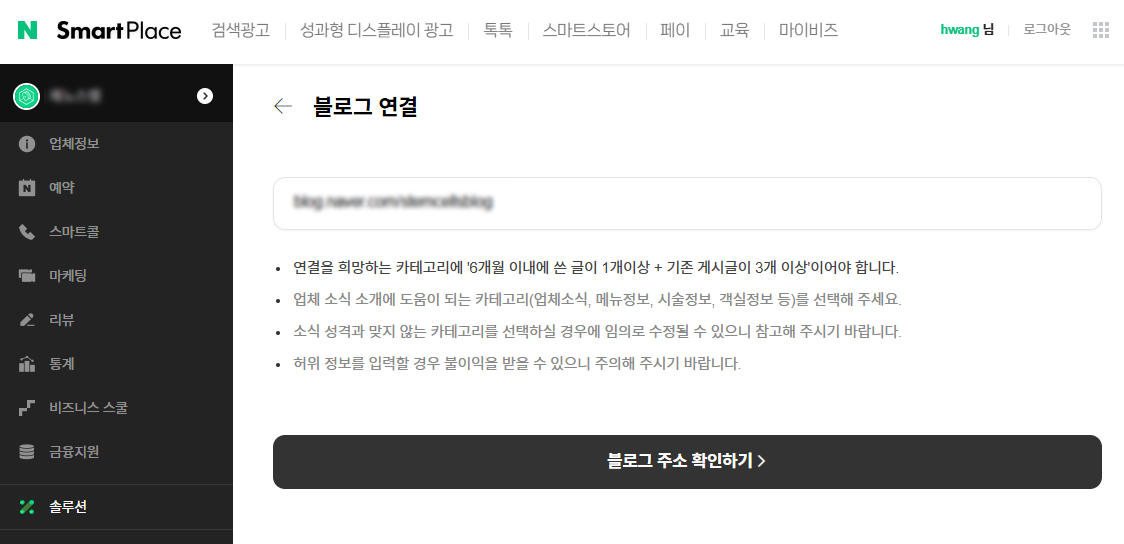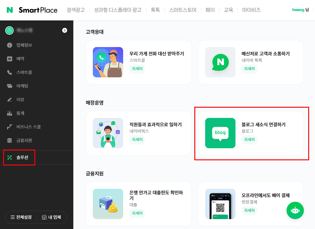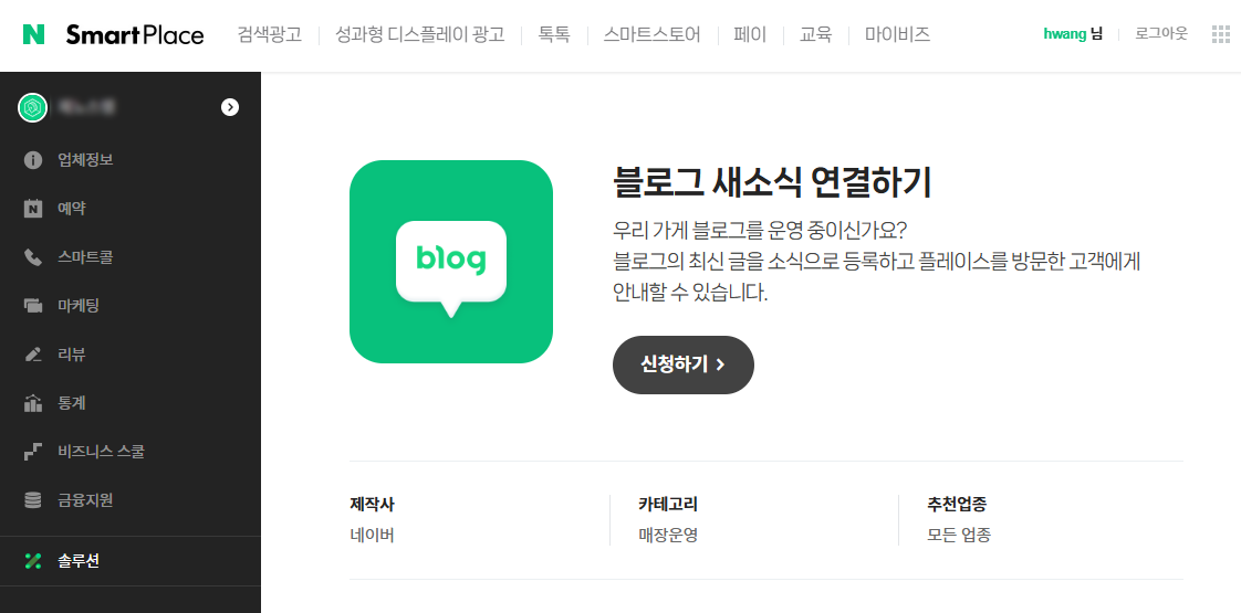업체명을 클릭하면 업체 관리화면으로 전환됩니다. '업체정보'메뉴는 업체 등록 시에 입력했던 여러 부가정보들을 수정할 수 있는 메뉴입니다. 내 블로그를 연동하기 위해 왼쪽 메뉴에서 '솔루션'을 클릭한 후 매장운영의 '블로그 새소식 연결하기'를 클릭합니다.