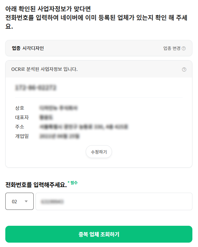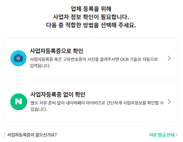 '사업자등록증으로 확인' 메뉴를 클릭한 후 준비한 사업자등록증 이미지를 첨부하면 자동으로 정보를 인식해 줍니다. '사업자등록증 없이 확인'을 클릭할 경우 대표자 인증으로 진행할 수 있지만 개인사업자만 가능하니 참고해 주세요.