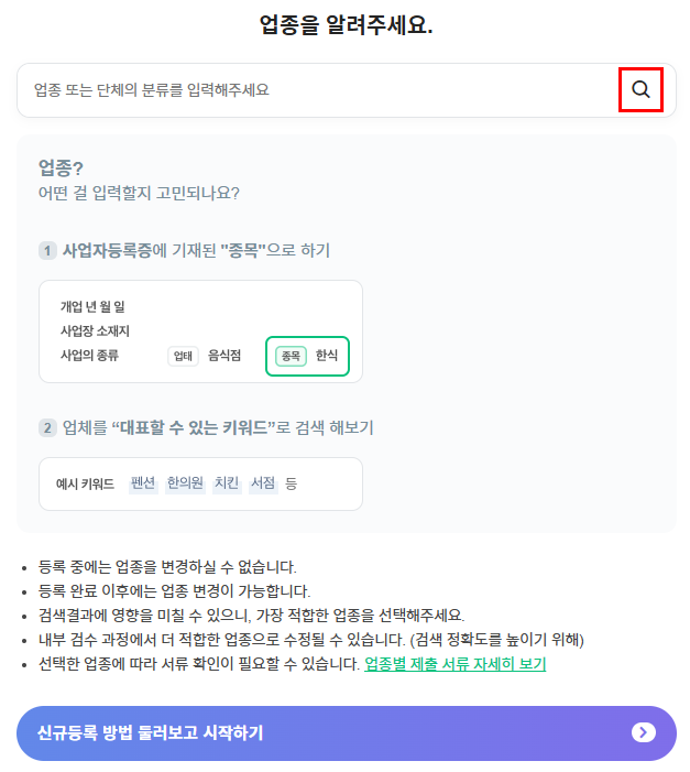 다음 화면에서 사업자등록증상의 업종을 입력하기 위해 돋보기 아이콘을 클릭합니다. 업종별로 메뉴구성이 조금씩 다르기 때문에 주 업종을 정확하게 입력합니다. (소매점이나 식당 등은 가격정보가 있는 반면, 병원이나 의원 등은 질병명 정보가 보이게 됩니다)