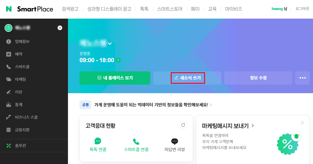 새 소식을 이용해서 공지로 등록하는 방법입니다. 네이버 스마트 플레이스에 접속한 후 '새소식 쓰기'를 클릭합니다.