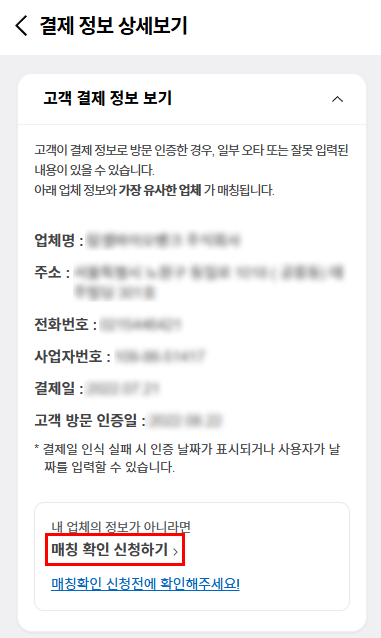 내 업체가 아닌 리뷰일 경우 결제 정보 상세보기 화면 아래쪽에 있는 '매칭 확인 신청하기'를 클릭한 후 신청해 주면 됩니다.