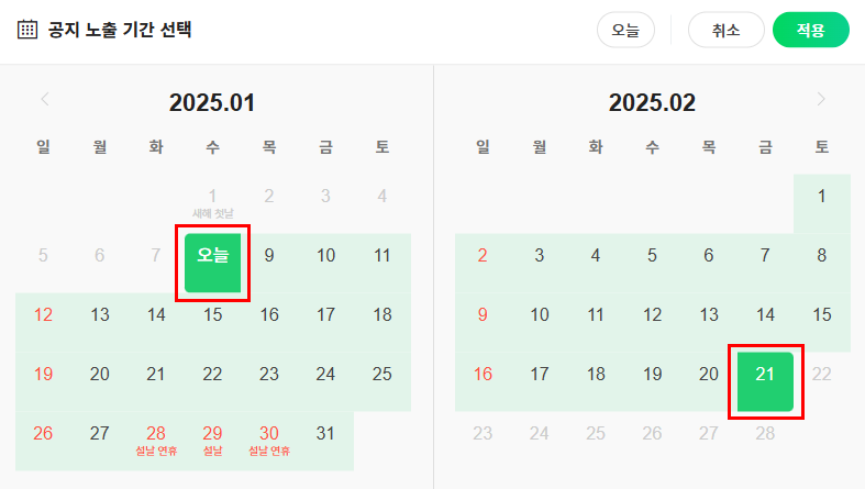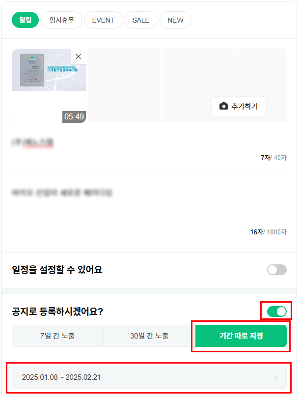 동영상을 추가한 후 아래쪽의 '공지로 등록하시겠어요?'를 활성화합니다. 기간은 일주일이나 한 달 설정할 수도 있고 최대 45일 동안 공지가 가능합니다. 그 이후로도 하고 싶으면 계속 기간을 수정 등록해 주면 됩니다.
