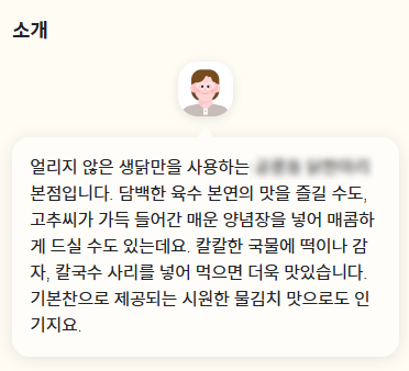 모든 노출의 기본은 업체정보입니다. 스마트플레이스 등록 후 업체 정보를 꼼꼼히 빠지지 않게 잘 작성하여야 합니다. 업체 상세설명은 누가 봐도 매력적이게 작성해야 합니다. 글자수도 2000자까지 가능하므로 업체의 장점을 잘 드러나게 작성해 주세요. 아래 소개글을 보면 식당의 메뉴뿐만 아니라 소개글만으로도 입에 침이 고이는 멋진 글입니다. 어조(말투)에서도 진한 육수의 느낌이 납니다.