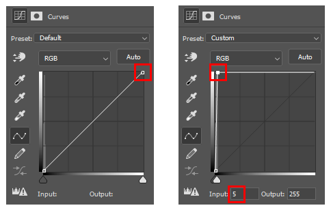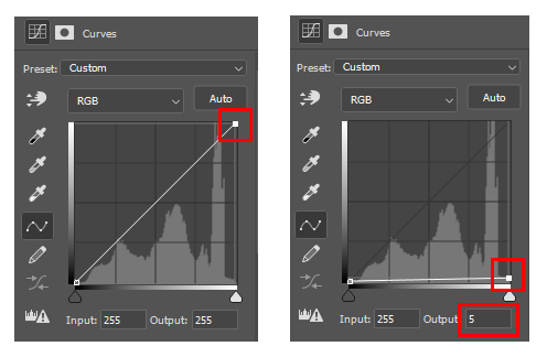 Curves의 사선 오른쪽 위에 있는 조절점을 아래쪽으로 이동하여(Output:5) 밝아지는 정도를 어둡게 확 줄여줍니다. 이렇게 하면 원본이미지가 아주 어둡게 변하게 되어 거의 검은색 이외에는 보이지 않게 됩니다.