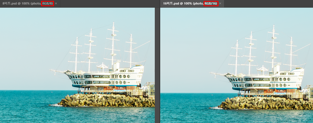 흔히 사용하는 인터넷 이미지는 앞서 말씀드렸듯이 대부분 8비트입니다. 일반적으로 8비트로 작업한 결과물과 16비트로 작업한 결과물을 동시에 놓고 볼 경우 구분하기가 쉽지 않습니다. (파일명 오른쪽에 색상 모드와 함께 색상 심도가 표시되어 있습니다.)
