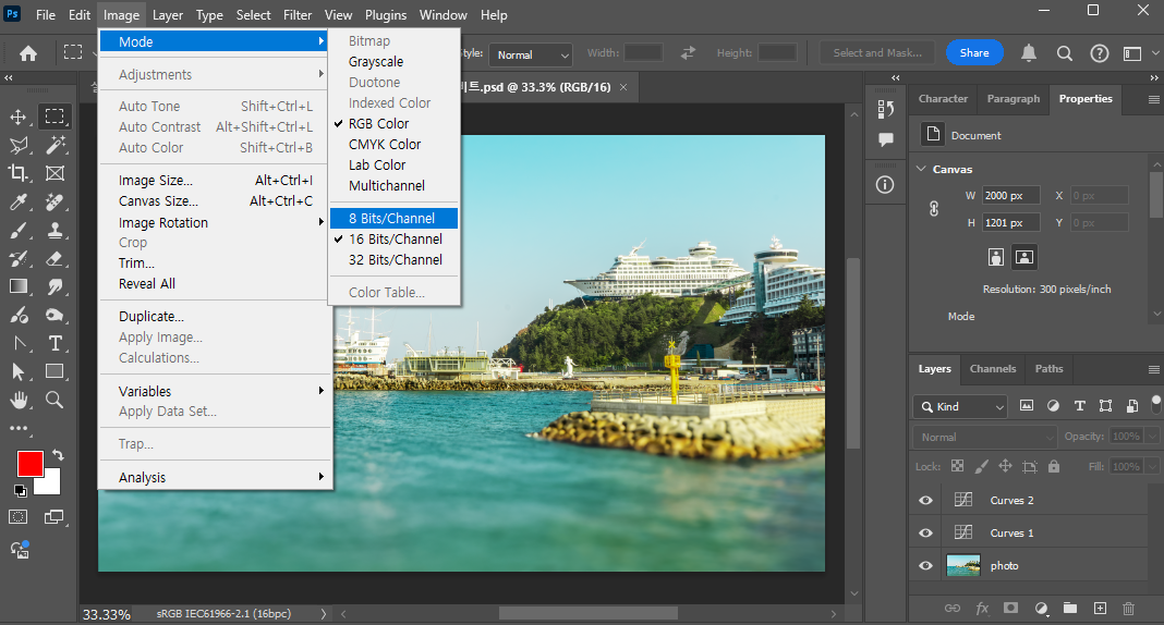 앞서 작업했던 16비트 이미지에서 Curves레이어 두 개를 유지한 채 Image>Mode>8Bits/Channel메뉴를 클릭하여 8비트의 색상심도로 변경해 줍니다.
