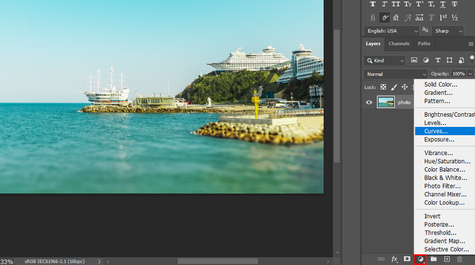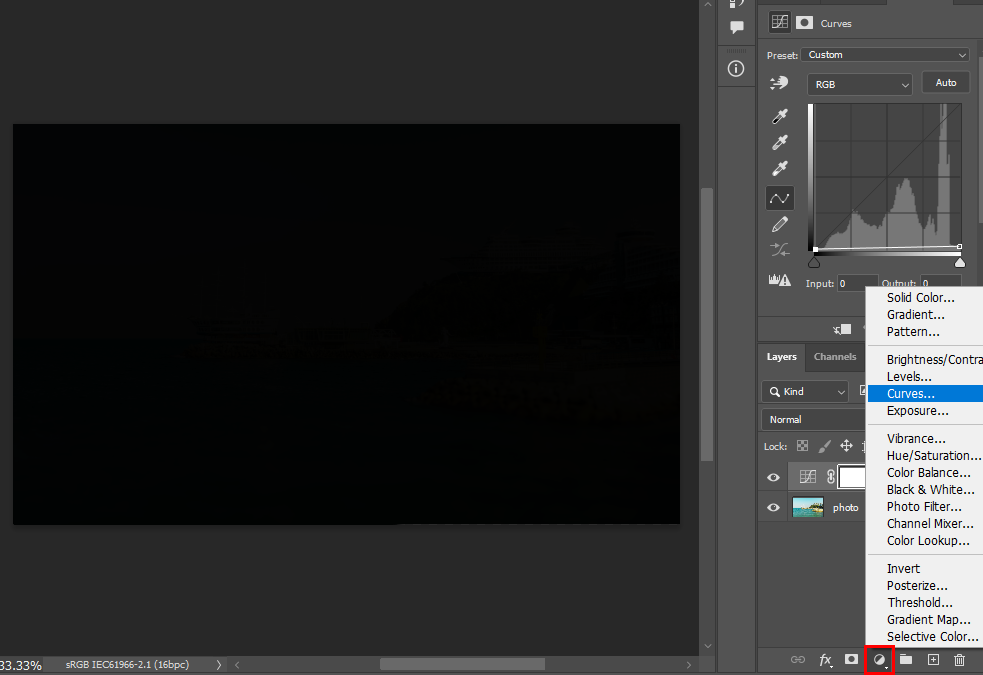 포토샵에서 raw파일을 오픈하면 Camera Raw Filter가 자동 실행되고 보정 후에 Open을 하면 색상 정보가 풍부한 16비트 파일이 생성됩니다. 보정을 극한으로 할 경우 이미지가 어떻게 변하는지 테스트해 보겠습니다. 16비트 포토샵 파일이 생성되면 레이어 창 하단의 조정레이어 아이콘을 클릭한 후 Curves메뉴를 선택합니다.
