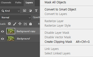 복제된 Background copy 레이어에 마우스 오른쪽 버튼을 클릭한 후 드롭다운메뉴에서 'Convert to Smart Object'메뉴를 선택합니다. 이렇게 고급객체(Smart Object)로 변환된 레이어는 이후에 필터효과나 레이어스타일, 조정레이어 등을 적용해도 원본에 직접 적용되는 것이 아니라 고급객체에 적용됩니다. 원본은 유지되기 때문에 언제든 원본 이미지를 언제든 바꿀 수 있습니다. 또한 다양한 효과 적용 이후에 언제든 수정이 가능하기 때문에 이미지는 습관적으로라도 고급객체로 변환하는 것이 좋습니다. (물론 이렇게 하면 파일의 용량이 많이 커지게 됩니다.)