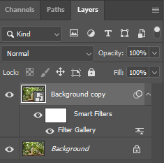 레이어를 보면 해당 레이어 아래에 Smart Filters가 생기고 그 아래에 Glass 필터를 적용한 Filter Gallery가 생겼습니다. 추후에 Glass 필터를 조정하고 싶을 경우 언제든지 Filter Gallery를 더블클릭해서 수정하면 됩니다.