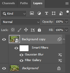 Gaussian Blur를 적용한 후 레이어를 확인해 보면 Gaussian Blur 이름을 추가된 것을 볼 수 있습니다. 이 또한 고급객체에 적용된 것이 때문에 수정을 원한다면 언제든지 Gaussian Blur 이름을 더블클릭하면 됩니다.