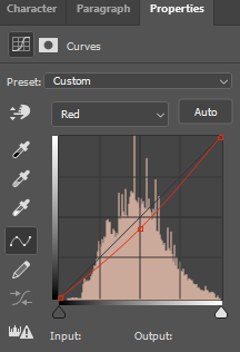 푸르스름한 색상(Cyan)을 추가하기 위해서는 Curve 조정 레이어에서 Red채널을 이용하면 됩니다. 위 이미지처럼 Red채널의 직선에서 중앙 부분을 드래그해서 아래로 이동하여 주면 푸르스름한 색상으로 바뀝니다.