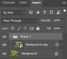 이미지 레이어 자체에 마스크 처리를 해도 되지만 레이어그룹을 만들어서 마스크 처리해 보겠습니다. 우선 Background Copy 레이어를 레이어창 아래쪽의 폴더아이콘으로 드래그하여 레이어 그룹을 생성하였습니다.