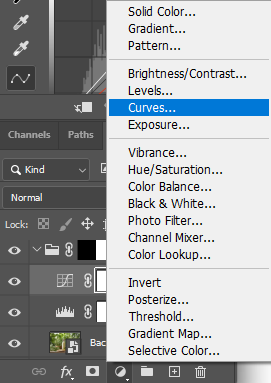 이후에는 Curve를 이용해서 유리에 푸르스름한 느낌을 추가하겠습니다. 레이어창 하단의 조정레이어 아이콘을 클릭한 후 Curves메뉴를 선택합니다.