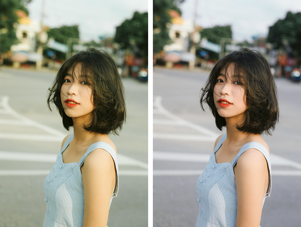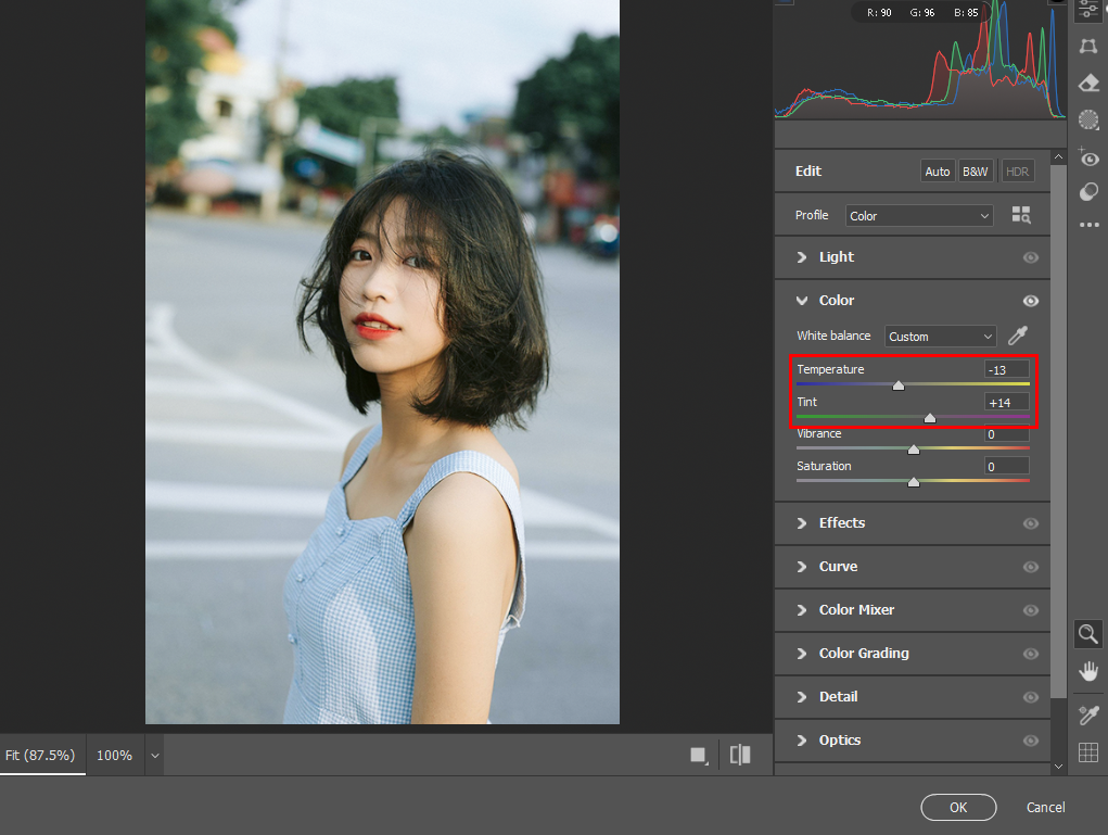 Color항목에서 Temperature(색온도)와 Tint(색조)를 조정해서 화이트밸런스를 맞출 수 있습니다. 조절바의 색상을 보면 알 수 있듯이 Temperature는 파란색과 노란색을 추가하거나 제거해 줄 수 있고 Tint는 초록색과 마젠타색을 추가하거나 삭제해 줄 수 있습니다. 원본사진의 노란색과 초록색을 제거해 주기 위해 Temperature는 -13 정도로 이동해 주었고, Tint는 +14로 이동해 주었습니다. 왼쪽의 사진을 참고하면서 조정해 주시면 됩니다.