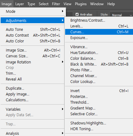 메뉴에서 Image > Adjustments > Curves 를 선택합니다.