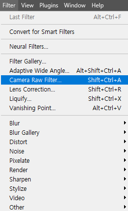 포토샵에는 라이트룸처럼 사진 보정을 할 수 있는 Camera Raw Filter 메뉴가 있습니다. 화이트밸런스를 맞추기 위해 해당 메뉴를 선택합니다.