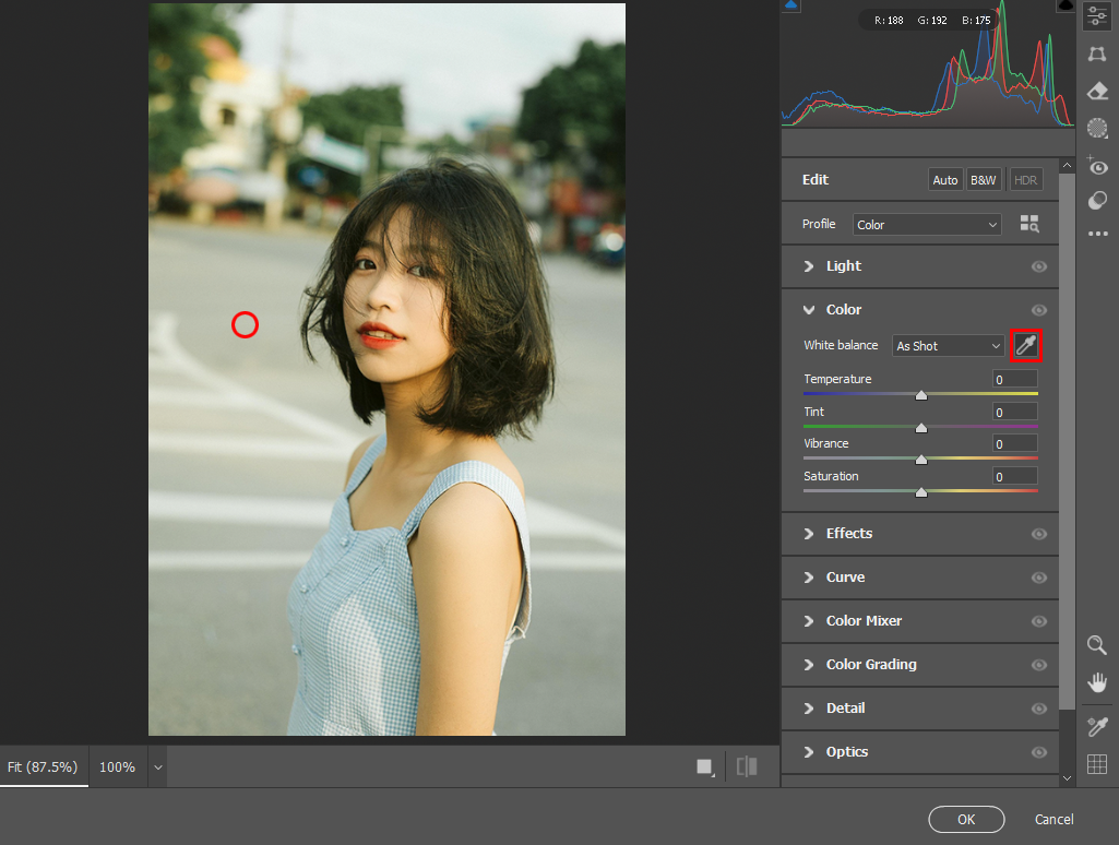 Camera Raw Filter 창이 열리면 오른쪽 메뉴에서 Color를 클릭하여 확장한 후 White balance 항목의 오른쪽에 있는 스포이드를 선택합니다. 사진에서 회색 아스팔트를 클릭합니다. 보정이 되었으면 하단의 OK 버튼을 눌러서 창을 닫아줍니다.