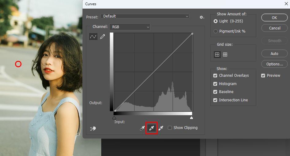 Curves창에서 그래프 하단의 스포이트 아이콘 중에서 가운데 아이콘을 선택합니다. Levels적용때와 마찬가지로 회색 아스팔트를 클릭해 줍니다. 보정이 되었으면 OK 버튼을 눌러서 커브 창을 닫아줍니다.