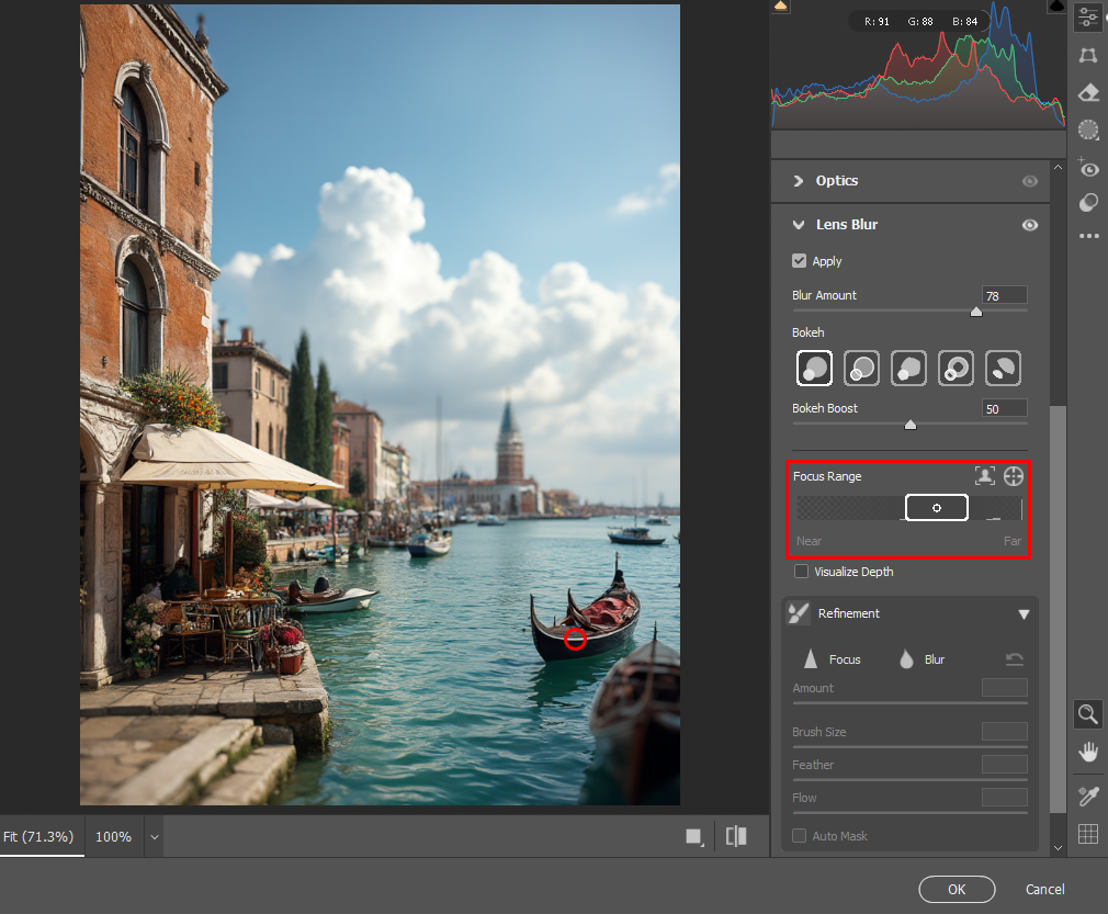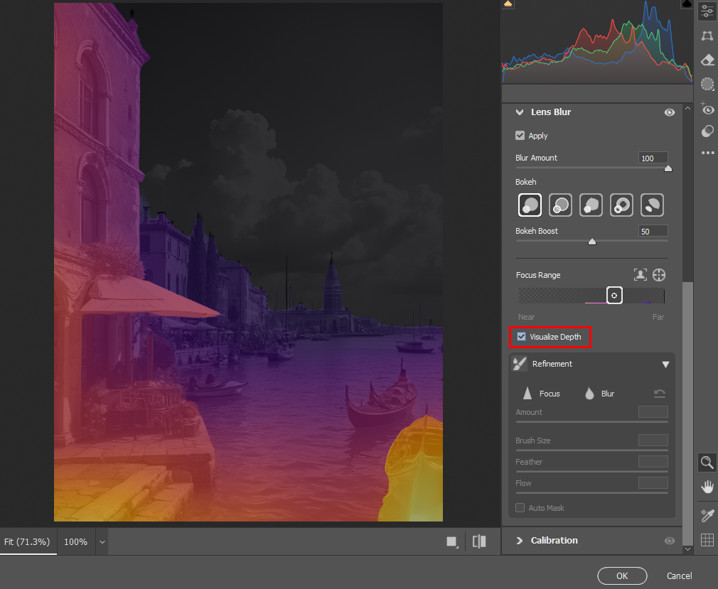 Visualize Depth를 선택하면 사진을 노란색 > 빨간색 > 보라색 > 파란색 그라데이션으로 표시해 줍니다. 화면에서 멀어지는 정도를 그라데이션으로 보여주는 기능입니다. Focus Range를 조절하면 실시간으로 그라데이션이 변경되기 때문에 훨씬 직관적입니다.