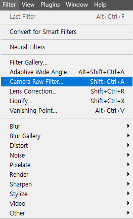 상단의 메뉴에서 Filter > Camera Raw Filter를 선택합니다.