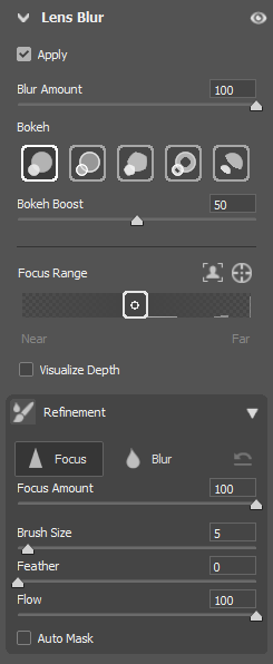 아웃포커싱 효과를 적용하다 보면 가늘고 섬세한 부분은 제대로 적용이 안 되는 경우도 발생합니다. 이럴 경우에는 Refinement를 이용해서 부분적으로 선명하게(Focus) 하거나 흐리게(Blur) 처리할 수 있습니다. 하단의 Auto Mask를 하고 작업하시면 영역을 인식해서 적용해 줍니다.