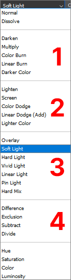 블렌딩모드는 다양한 방법이 있습니다. 각 영역별 특징만 간단히 설명드리면 1영역은 이미지의 색상이 겹쳐지면서 진해지거나 어두워지는 방식(감산혼합)이고, 2영역은 색상이 겹쳐지면서 밝아지는 방식(가산혼합)입니다. 3번은 밝은 영역과 어두운 영역이 서로 다른 방식(감산+가산)으로 적용되고, 4번은 특수한 방식으로 적용됩니다. 맨 아래쪽은 색상, 채도, 명도 등이 선택적으로 적용되는 방식입니다. 원본의 사진을 크게 왜곡시키지 않으면서 자연스럽게 적용되는 대표적인 블렌딩 모드는 Soft Light입니다. 파스텔톤의 컬러를 자연스럽게 적용하기 위해 Soft Light를 선택합니다.
