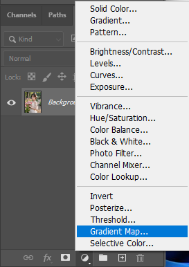 원본 이미지를 손상시키지 않고 적용하기 위해 조정레이어를 이용해서 보정하겠습니다. 다양한 보정방법이 있지만 가장 유용한 그라디언트맵(Gradient Map)을 이용하겠습니다. 레이어창 하단의 조정레이어를 클릭한 후 Gradient Map메뉴를 선택합니다.