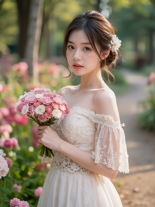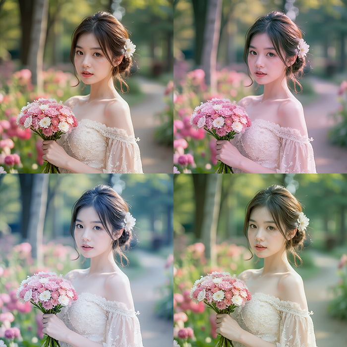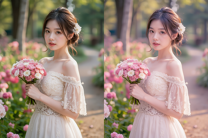 꽃을 든 여자의 모습니다. 화이트밸런스가 잘 맞는 자연스러운 이미지입니다. 컬러그레이딩은 화이트밸런스를 맞춘 뒤에 적용해 주어야 제대로 된 색감을 낼 수 있습니다. 화이트밸런스를 맞추는 방법은 이전글을 참고해 주세요.
