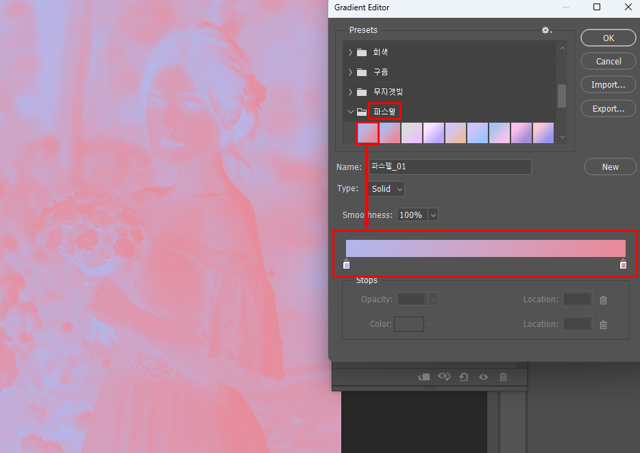 그라디언트 편집창이 열리면 위쪽에 있는 Presets에서 미리 세팅된 그라데이션 색상을 선택할 수 있습니다. 다양한 색상들을 제공하는데 파스텔 느낌을 주기 위해 파스텔 폴더를 선택하고 첫 번째 섬네일을 적용합니다. 아래쪽의 회색 그라데이션이 파스텔 그라데이션으로 바뀌면서 사진 이미지가 변하는 것을 확인할 수 있습니다. 그라데이션 바에서 왼쪽은 이미지의 어두운 영역이고 오른쪽은 밝은 영역입니다. 즉 원본 이미지의 어두운 영역은 파란색으로 표현되고 밝은 영역은 빨간색으로 표현되는 독특한 느낌의 이미지로 변경됩니다.