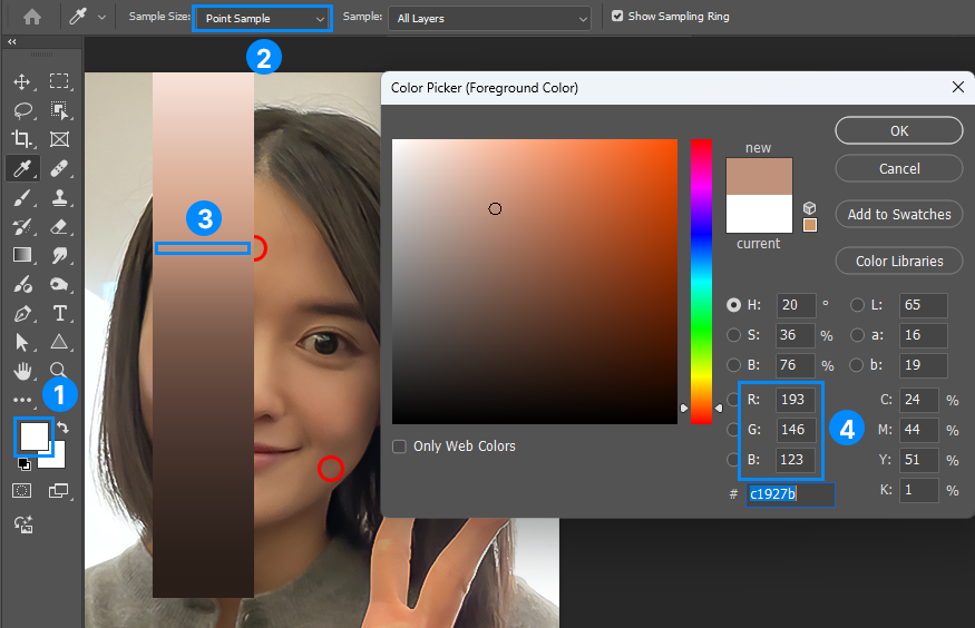 4. 샘플링한 색상의 RGB값이 변경되었습니다. RGB 값(R:193, G:146, B:123)을 메모해 둡니다.