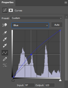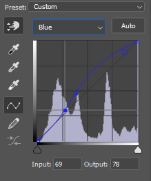 Blue채널도 수정하기 위해 상단의 채널항목을 클릭한 후 Blue 채널로 변경해 줍니다. 파란색 사선을 보면 중간쯤에 조그마한 사각형 포인트가 선택되어 있습니다. 선택된 상태를 유지하면서 아래쪽의 Output값을 앞서 피부톤에서 샘플링했던 값(123)으로 수정합니다.