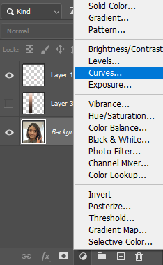 피부톤을 보정하기 위해 Curves를 이용하겠습니다. 사진이미지 레이어를 클릭한 후 레이어창 하단의 조정레이어를 클릭하여 Curves를 선택합니다.