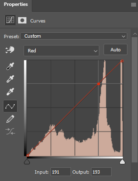 상단의 채널항목을 클릭한 후 Red 채널로 변경해 줍니다. 빨간색 사선을 보면 중간쯤에 조그마한 사각형 포인트가 선택되어 있습니다. 선택된 상태를 유지하면서 아래쪽의 Output값을 앞서 피부톤 이미지에서 샘플링했던 값(193)으로 수정합니다.