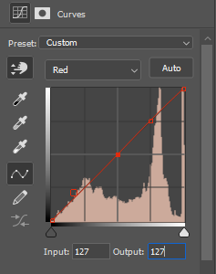 속성창에서 상단의 채널항목을 클릭한 후 Red 채널로 변경해 줍니다. 조그마한 사각형 포인트가 선택된 상태를 유지하면서 아래쪽의 Output값을 127로 수정합니다.