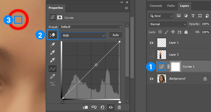 동일한 Curves레이어의 섬네일을 더블클릭해서 속성창을 열고 Click and Drag아이콘을 클릭합니다. Ctrl+Shift키를 누른 채로 3번 영역을 클릭하여 색상을 샘플링합니다.
