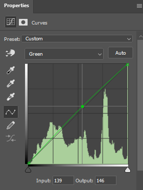 Green채널도 수정하기 위해 상단의 채널항목을 클릭한 후 Green 채널로 변경해 줍니다. 연두색 사선을 보면 중간쯤에 조그마한 사각형 포인트가 선택되어 있습니다. 선택된 상태를 유지하면서 아래쪽의 Output값을 피부톤 이미지에서 샘플링했던 값(146)으로 수정합니다.