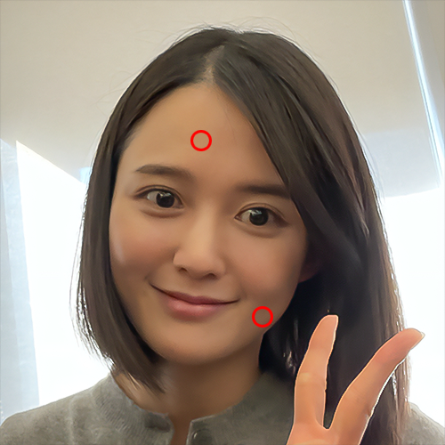 이미지의 피부색을 보정하기 위한 기준은 위 사진처럼 동그란 두 개의 영역을 기준으로 맞추겠습니다. 상단의 원은 얼굴톤의 가장 많은 영역을 차지하는 대표 색상으로 설정하였고 하단의 원은 얼굴의 어두운 영역을 대표하는 색상으로 설정하겠습니다. 사진이미지를 오픈한 후 피부톤 이미지를 불러옵니다.