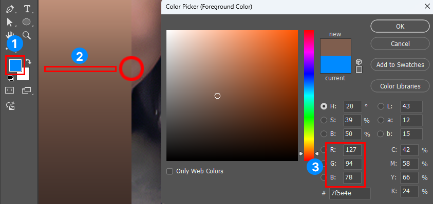 Fourground Color를 클릭한 후 동일한 밝기를 가지는 피부톤 영역을 클릭합니다. RGB값이 변경되었으면 각 채널별로 수치를 메모해 둡니다.