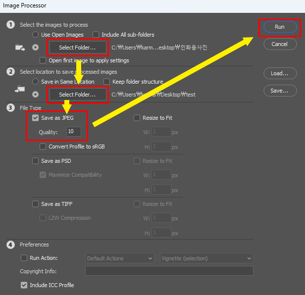 소스 파일이 있는 폴더를 선택한 후 새로운 파일이 저장될 폴더를 선택합니다. 원하는 파일 타입을 선택한 후 우상단의 Run버튼을 클릭하면 포토샵에서 알아서 오픈하고 자동으로 포맷을 변경하여 저장해 줍니다.