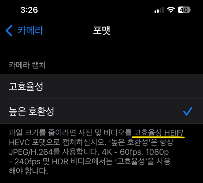 아이폰에서는 사진이나 비디오를 저장할 때 고효율성으로 설정하면 HEIF(동영상일 경우 HEVC포맷)포맷으로 저장할 수 있습니다. 하지만 이럴 경우 아이폰이 아닌 사람과 파일을 공유할 때는 호환이 되지 않아 볼 수 없는 경우가 발생하기도 합니다.
