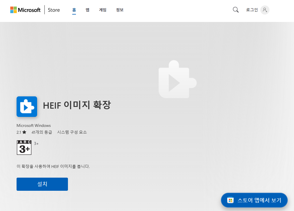 마이크로소프트 스토어앱에서 'HEIF 이미지 확장'을 검색하시거나 아래 링크를 클릭한 후 설치하면 됩니다.