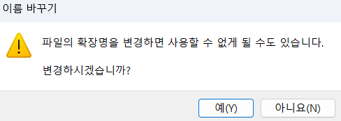 확장자를 바꾸면 위와 같이 경고창이 뜨는데 그냥 무시하고 '예'를 클릭해 주세요. 대소문자 구분 없이 확장자를 heif로 수정해 주면 됩니다.