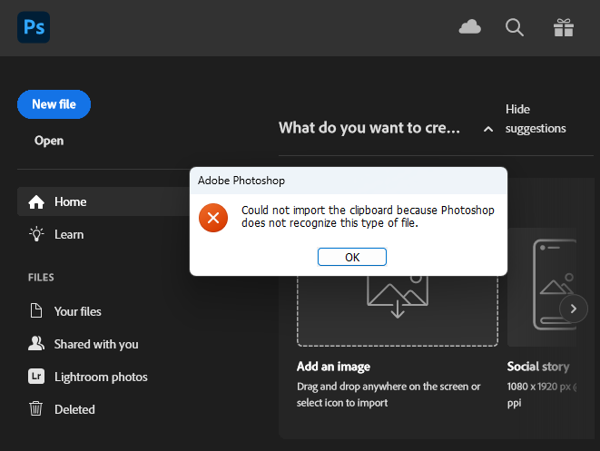 'HEIF 이미지 확장'앱을 설치한 후 포토샵에서 HEIF(HIF확장자)파일을 오픈하면 여전히 아래와 같은 에러메시지가 뜹니다.